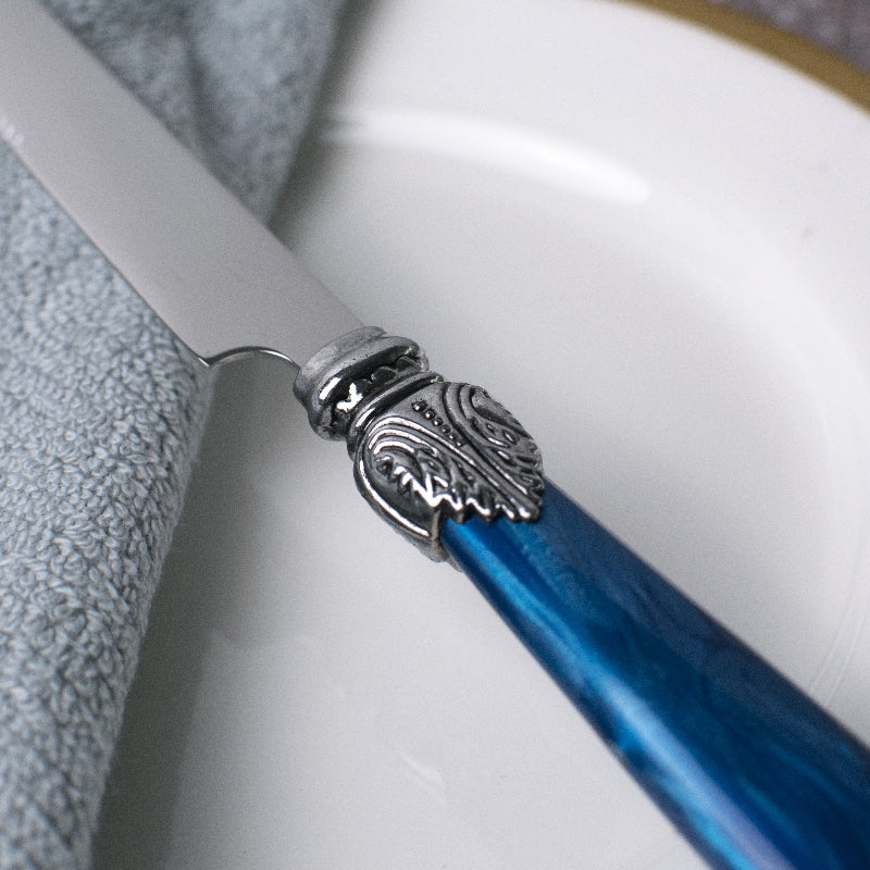 An intricate design Azure Accent Regal 24 Piece Cutlery Set will match your elegant serve wares. A lavish food presentation starts with premium serve ware, cutlery and drinkware. To add some royalty to your dining experience we have come up with this gorgeous cutlery set. The azure blue tone with the crystalline accent & antique silver design grip offers a unique look to it. This cutlery set consists of 6 tablespoon, 6 teaspoon, 6 fork and 6 knife. The silver tone of the cutlery set ensures a posh dining experience. From main course to dessert this cutlery set is perfect for all. This luxurious cutlery set is just the right match for all your serve ware.