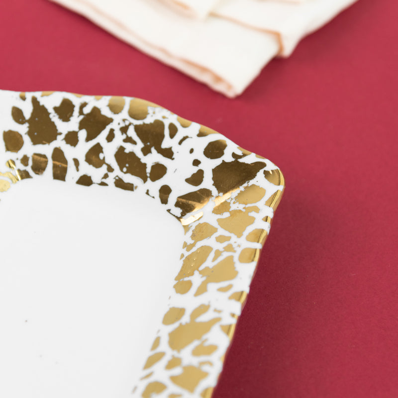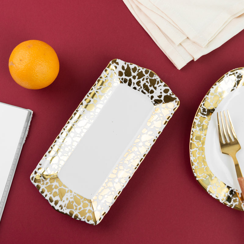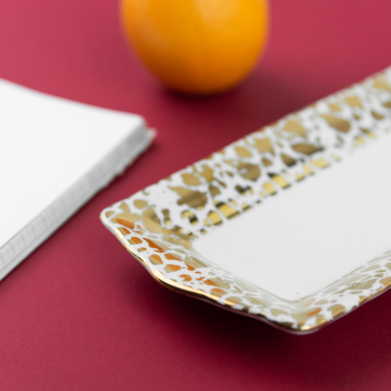 A Ornate Patch Pattern Serving Platter to sprinkle some elegance into your serve ware collection. If you are someone who has a love for ornate designs then this serving dish is just for you. Serve starters such as fries, chips, nachos, fritters, noodles, pasta and more in this unique rectangle serving dish. The design of the plate resembles patch work pattern which makes it even more special. This serving plate with a unique golden design can instantly enhance the look of your tableware or serve ware collection.